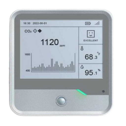 A multi-sensing device that contains integrated sensors for temperature, relative humidity, CO2, PM2.5 & PMJO, HCHO/CO3 and TVOC, while reporting values to the management system to provide real-time air quality monitoring.