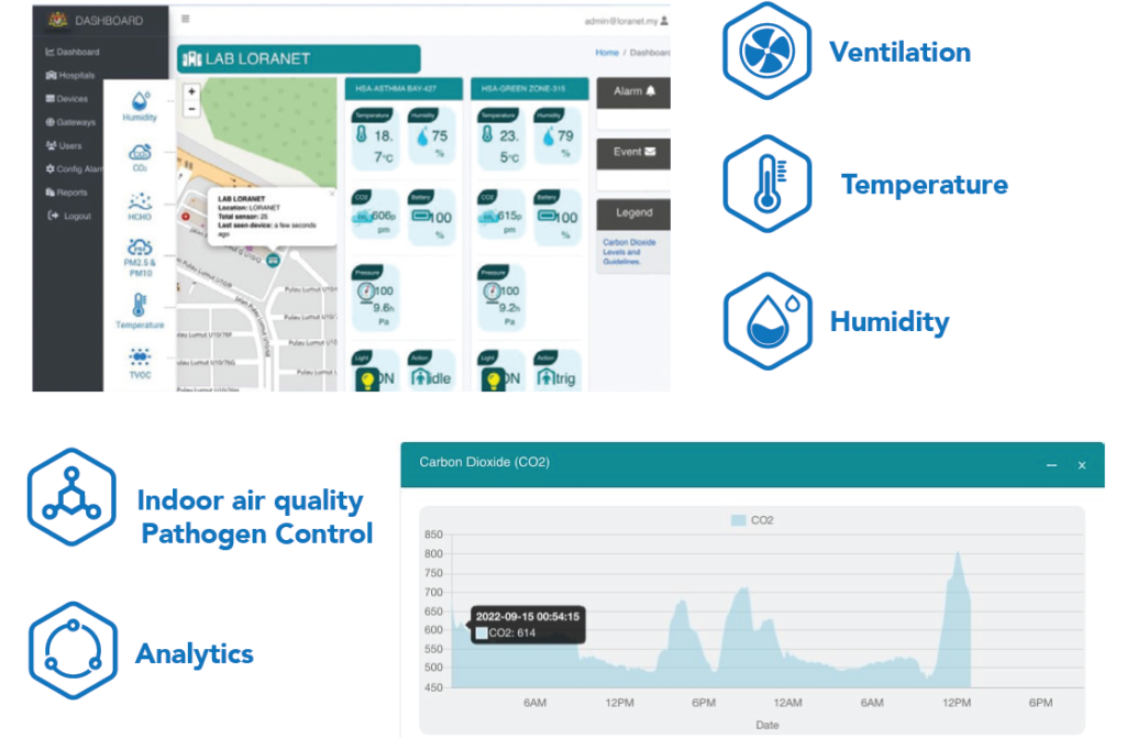 Real-time IoT sensors monitoring CO₂, temperature, humidity, and particulates to ensure healthy indoor environments in schools, offices, and smart buildings.